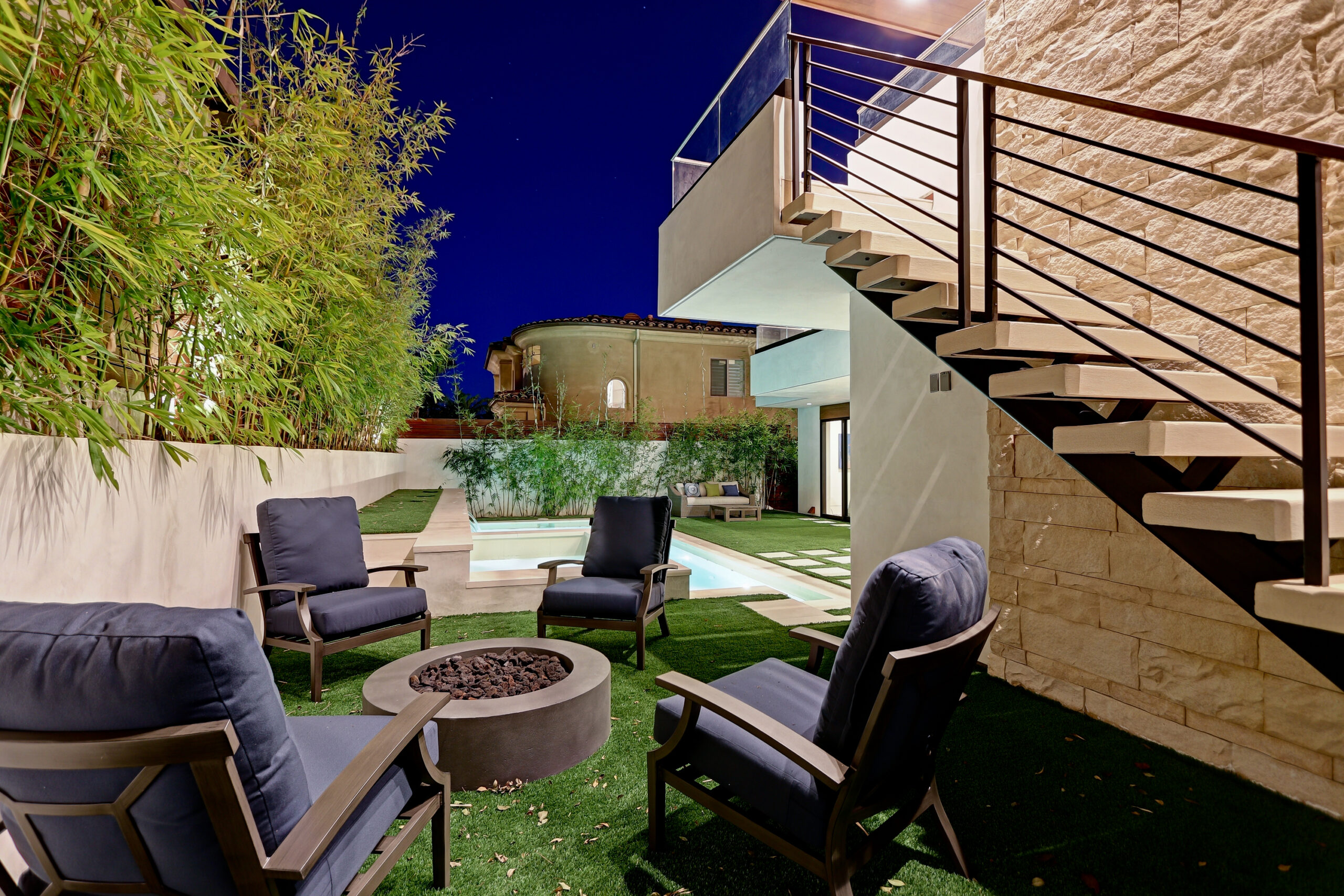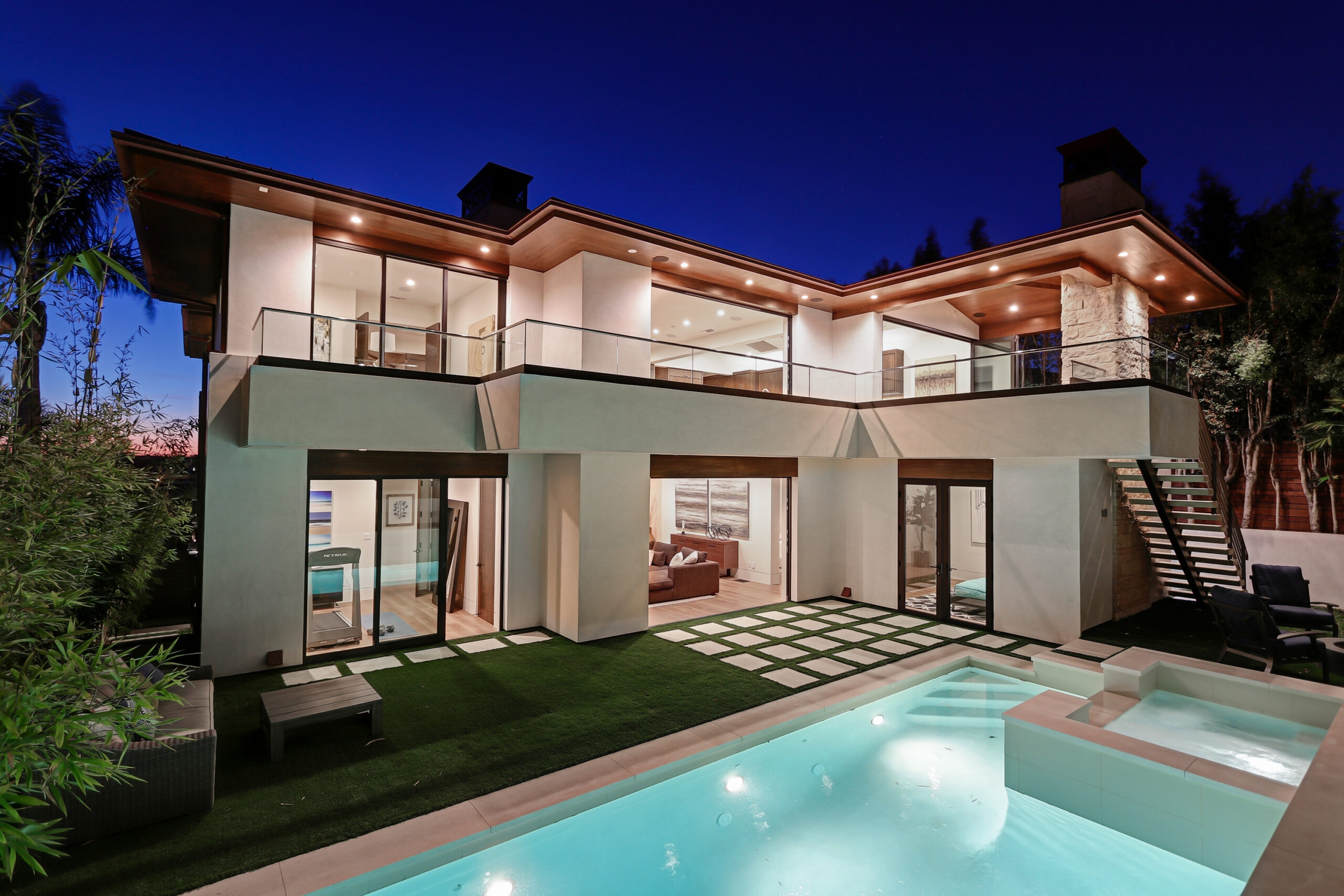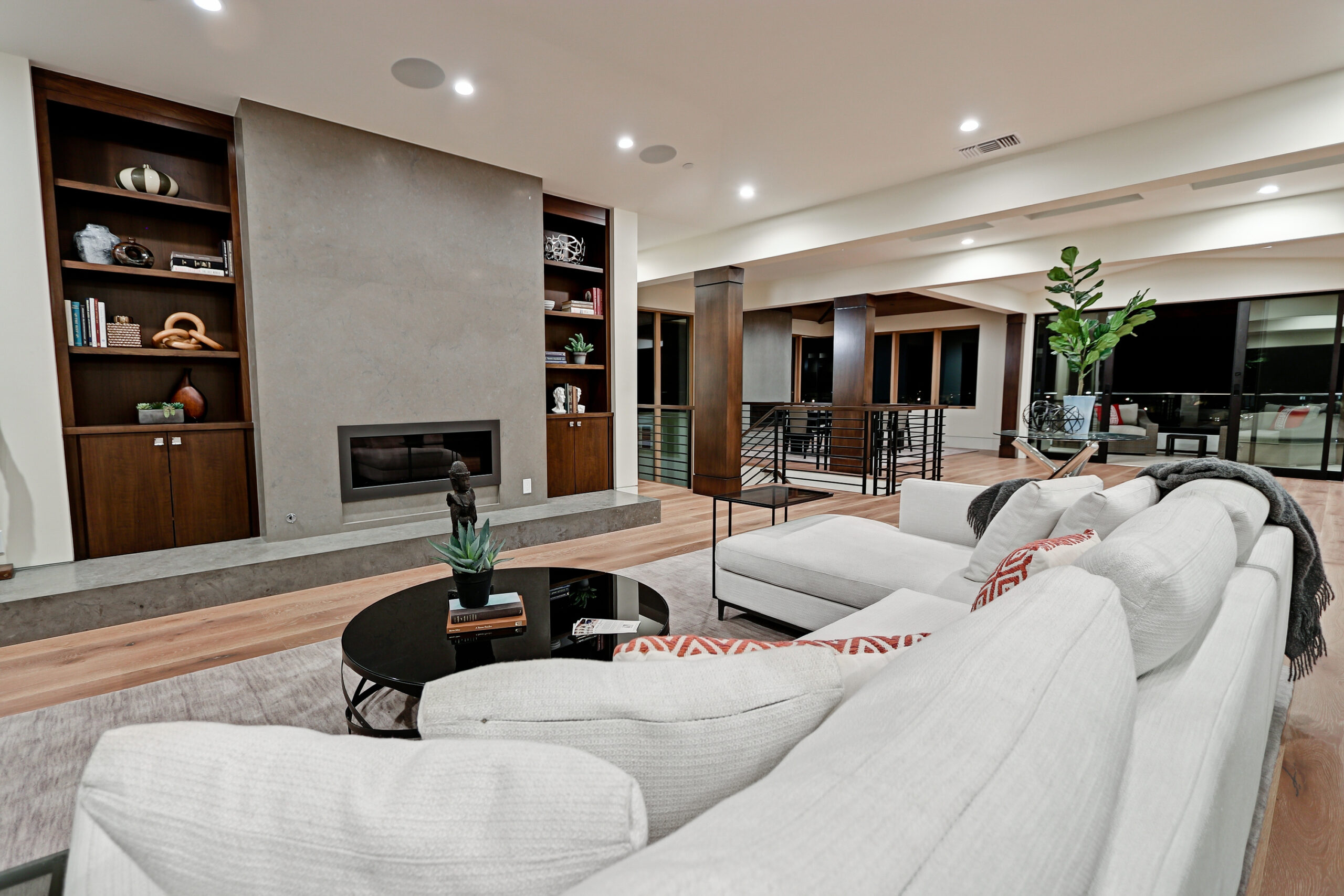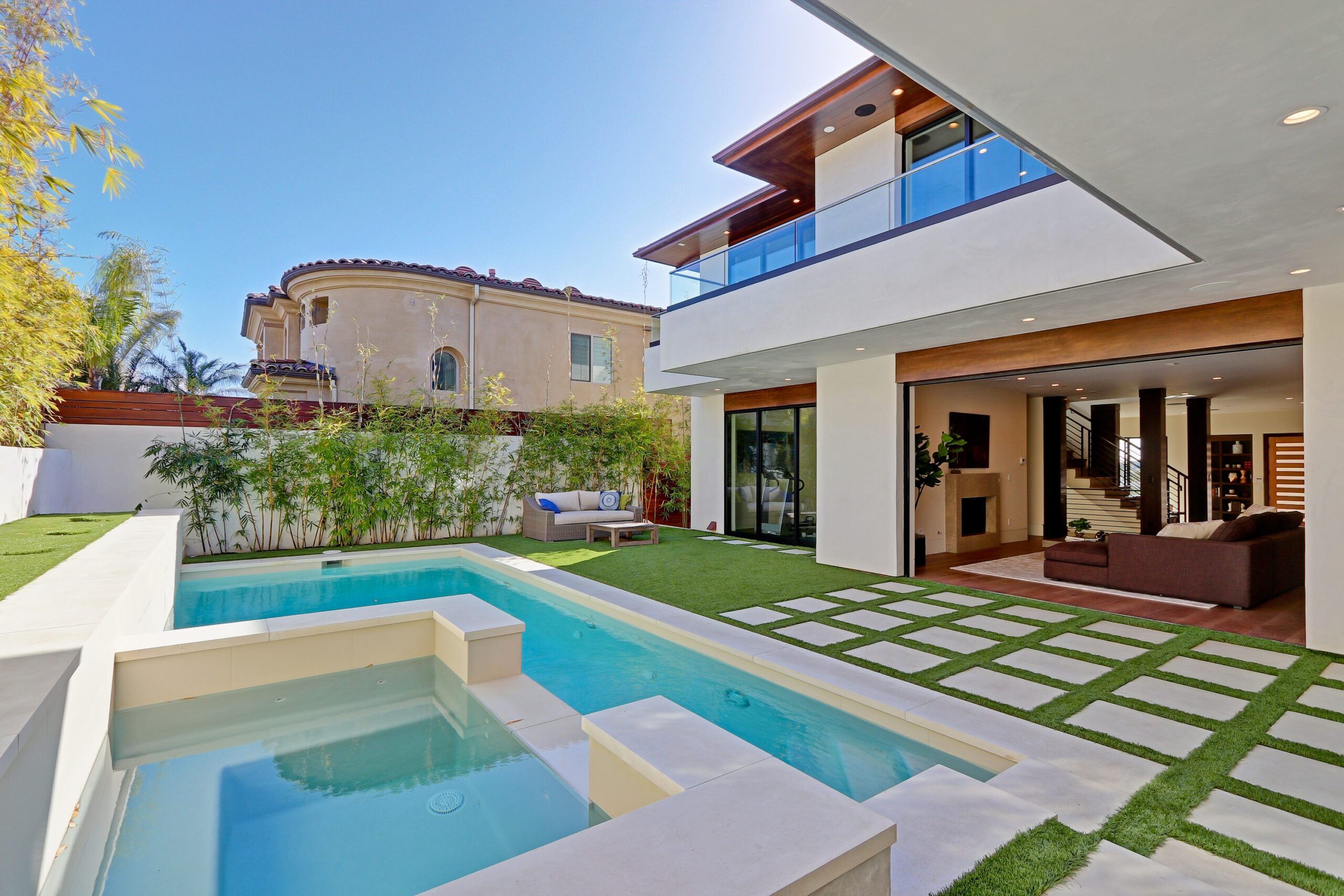 This high-end contemporary home is vertically organized to create distinct yet connected living zones, using subtle grade changes to establish hierarchy while maintaining clear sightlines to the yard, pool, and spa.
