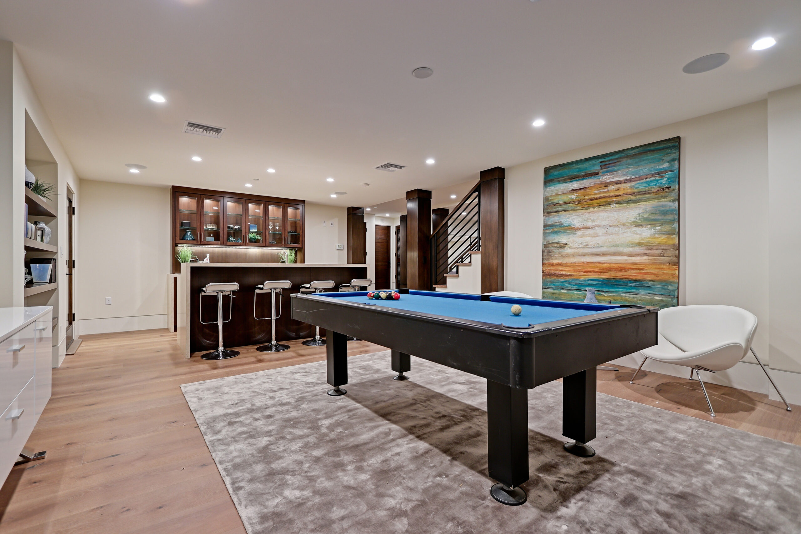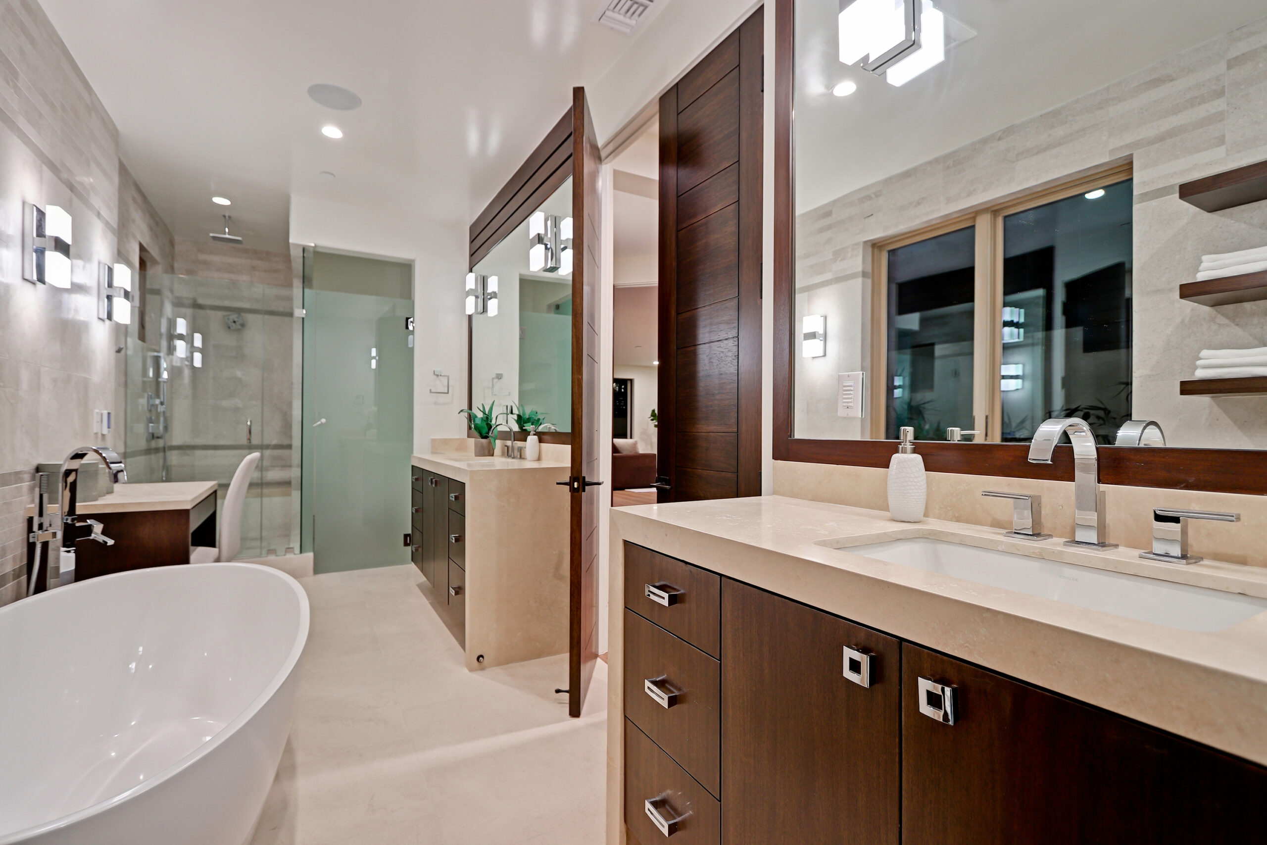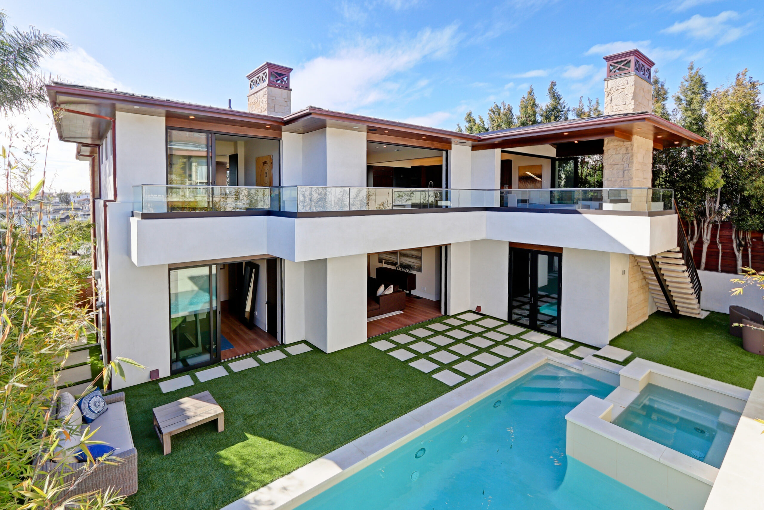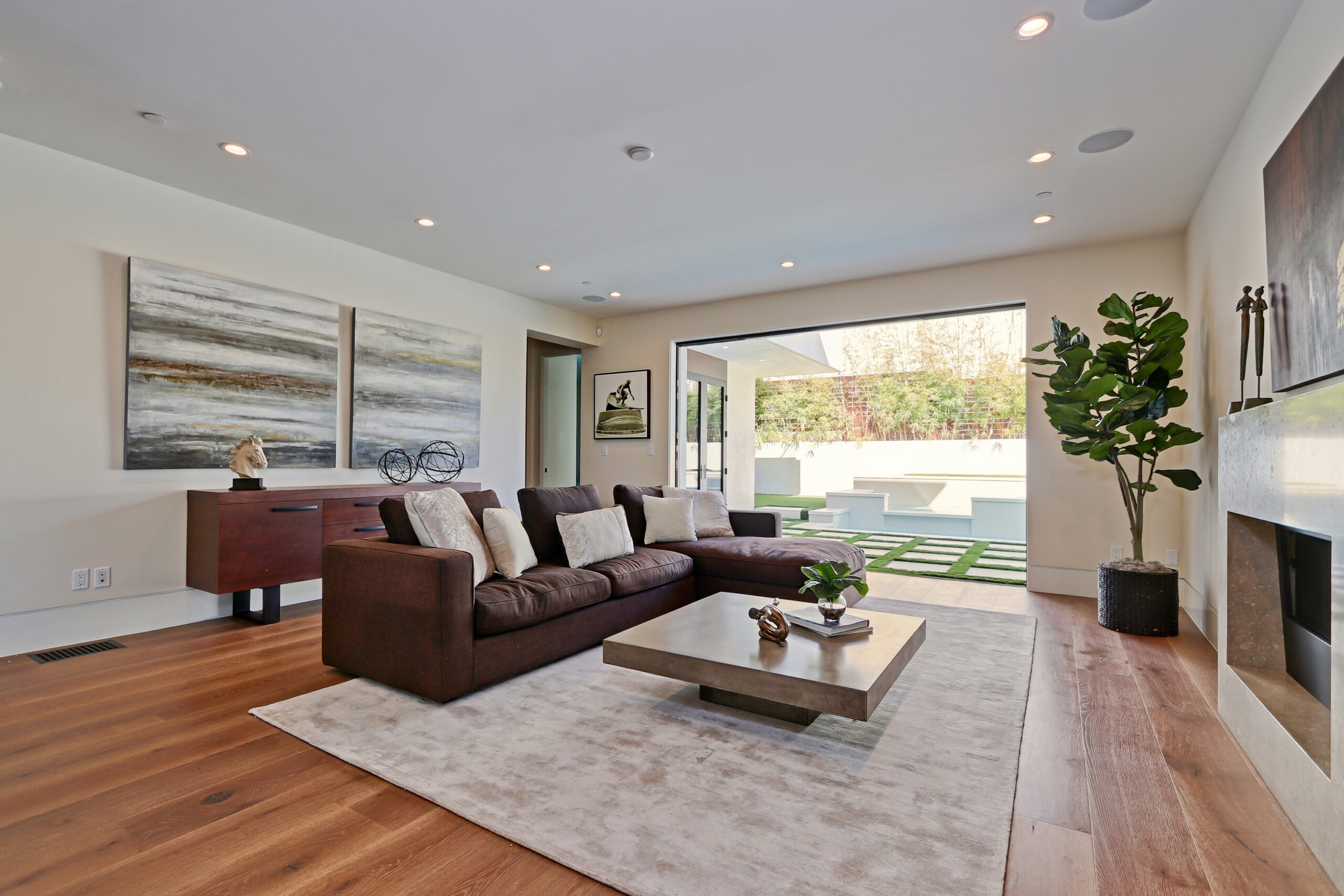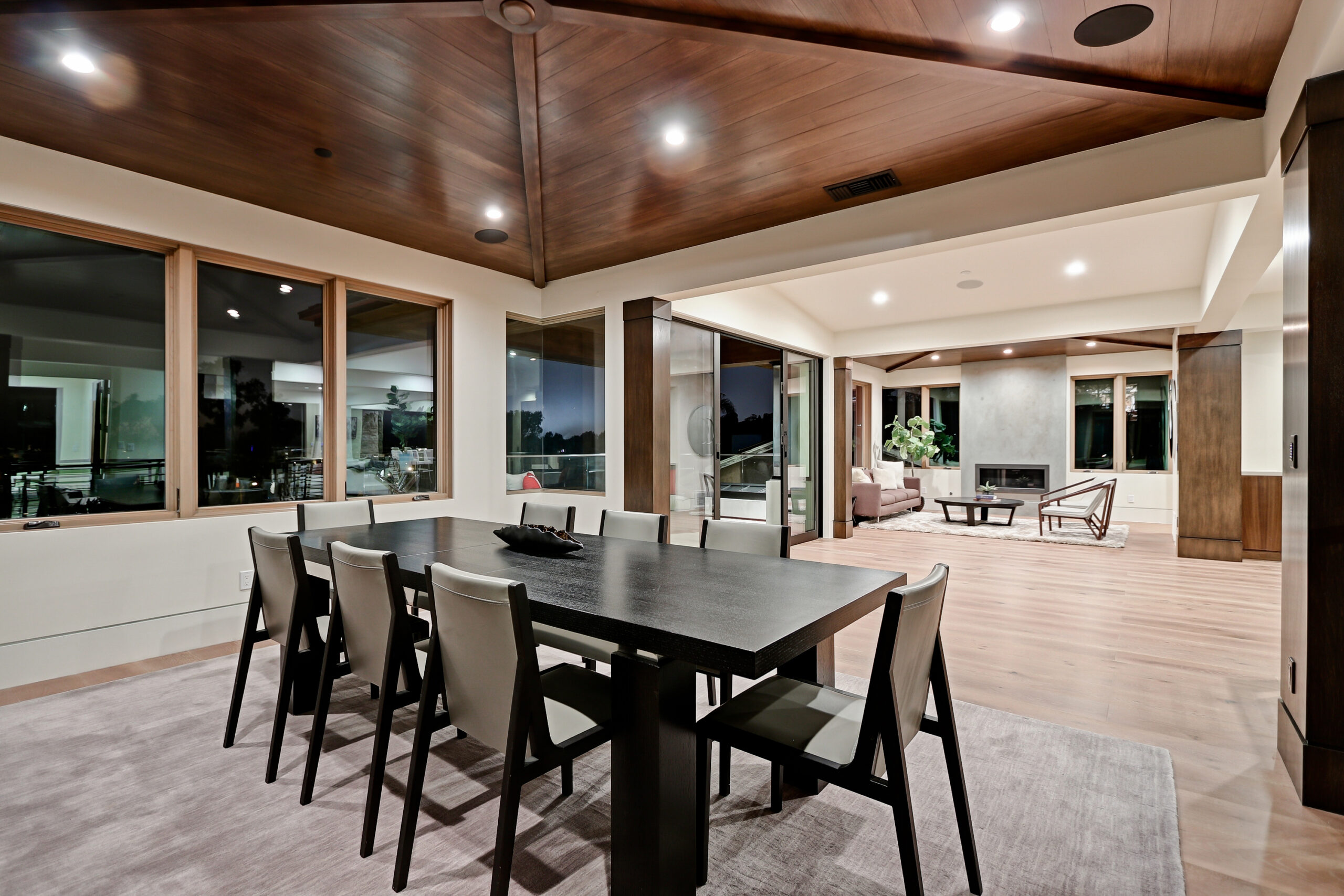 This high-end contemporary home is vertically organized to create distinct yet connected living zones, using subtle grade changes to establish hierarchy while maintaining clear sightlines to the yard, pool, and spa.